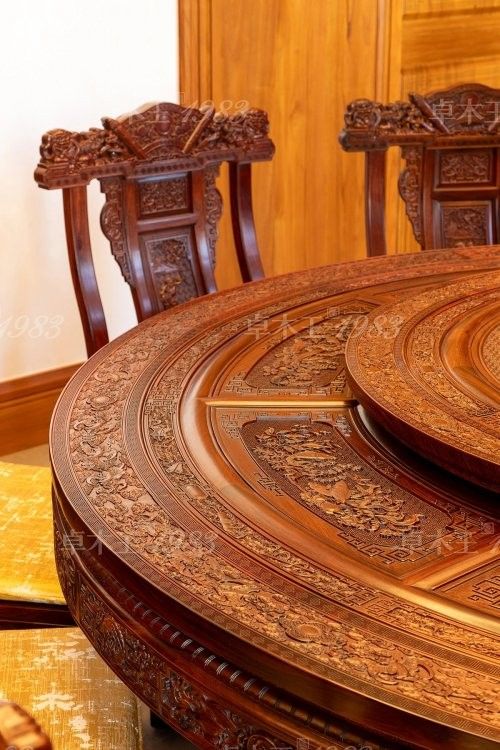 宴会空间以缅甸柚木整装定制,让宴饮兼具味觉享受与文化雅韵。中央典藏款红酸枝《中国梦·富春山居和谐圆台》纹理细腻,圆形设计暗藏团圆深意,适配家族聚会与贵宾宴请。24枚如意纹环绕的“圆融如意顶”与餐桌上下呼应,整装吊顶同侧边木雕相映成趣。空间巧用留白艺术,明式柜体与木作护墙简约碰撞,无冗余装饰更显格调,整体空间尽显高贵典雅。