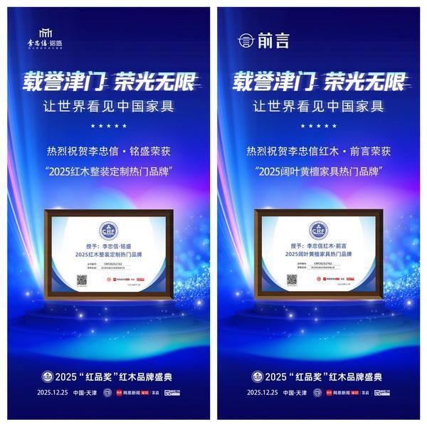 12月25日,第16届红木品牌峰会上,李忠信红木以“十六度蝉联”之姿摘得“红木家具十大影响力品牌”等四项殊荣,7月连获东阳“木雕家居产业十强企业”与“中国传统家具十大品牌”双认证,3月“元首椅”深圳国际家具展斩获“大国精品奖”,全年权威荣誉密度创行业新高。