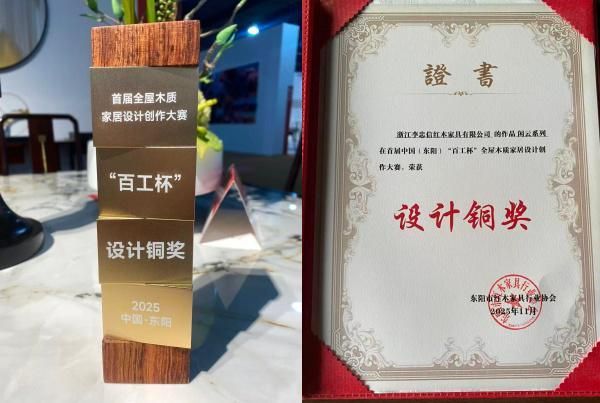11月22日,“百工杯”全屋木质家居设计创作大赛上,“闲云系列”斩获制作银奖与设计铜奖,董事长李忠信亲授学子拜师礼,德艺传承成行业佳话。4月浙江工艺美术精品博览会再夺两项金奖,五件精品亮相“东阳展厅”,以“双金闪耀”印证工艺美术标杆实力。