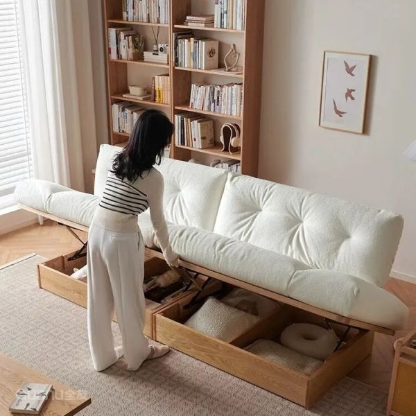 可储物沙发:在坐垫下方或扶手侧边设计隐藏储物空间,如抽屉、翻盖或开放格,用于收纳客厅杂物。