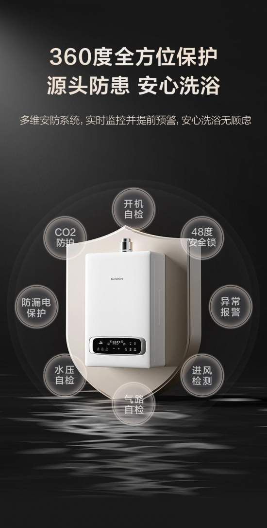 不仅如此,庆东纳碧安NGW580C还在细节上为恒温体验保驾护航。多维消音降噪设计,通过全密闭燃烧系统、燃烧室防震构造、隔音装置及低噪音变频风机,实现悄声运行,不影响用户生活;无惧-20℃低温的双重防冻科技,确保冬季极端天气下设备正常运行,水温不受低温影响;360度全方位安防系统,包括开机自检、CO防护、48度安全锁、防漏电保护等,让用户在享受恒温热水的同时,更添安心。