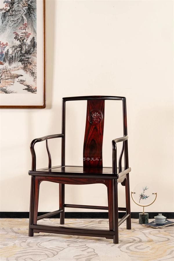 此椅原型为明・紫檀扇面形南官帽椅,出自王世襄《明式家具珍赏》(93页),更是王世襄《明式家具研究》一书的封面家具,堪称明式座椅的典范之作。搭脑呈优雅弧形,后腿一木连做,形制简练大气。后背板取“S”型曲线,与人体脊背自然贴合,兼具美学意蕴与人体工学考量,坐卧舒适,宜室宜家。