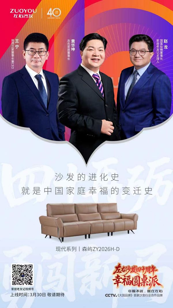当一张沙发的四十年,遇上中国家居行业从无到有、家庭生活从朴素到丰盈的四十年,便成了中国家庭幸福观最生动的注脚。值左右沙发四十载华诞之际,「幸福圆桌派——左右沙发40周年幸福对话」如约启幕,左右家居董事长黄华坤、居然之家董事长兼CEO王宁与行业资深学者赵龙博士,以时光为卷,回望家居行业四十年变迁,解码左右沙发从一张沙发到千万家庭幸福载体的成长密码,勾勒出中国家居从“物质刚需”到“精神悦己”的幸福进化史。